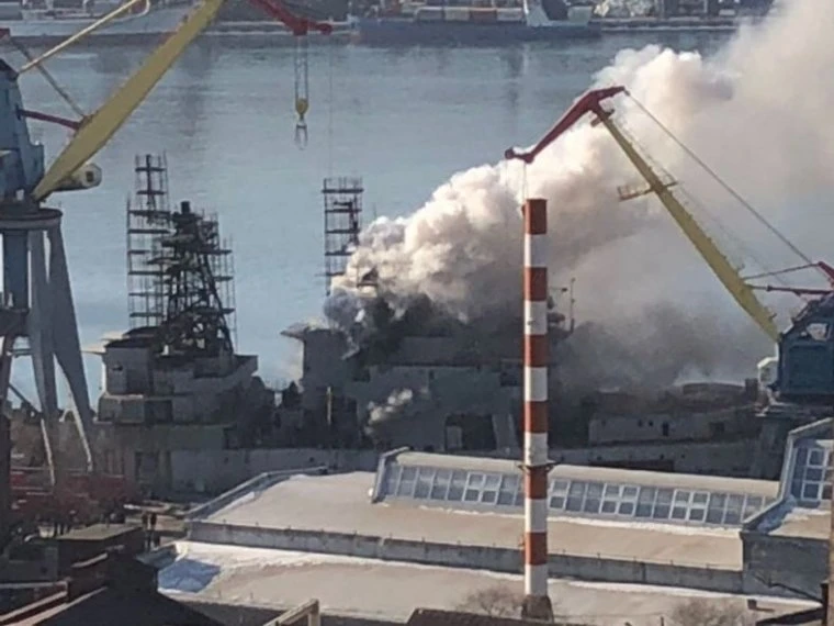 Khu trục hạm Marshal Shaposhnikov bốc cháy. Ảnh: Twitter