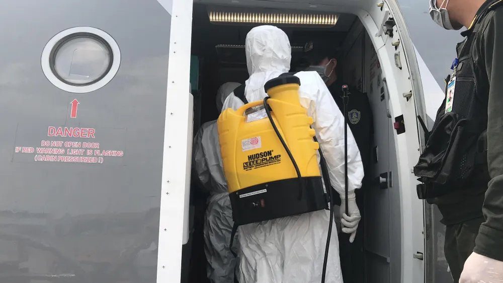 Nhân viên y tế lên máy bay để khử khuẩn. Ảnh: TÂM NGUYỄN
