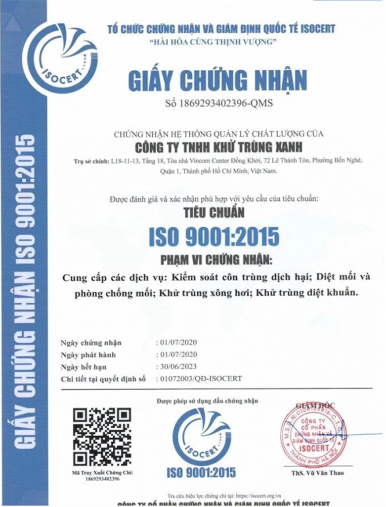 Các dịch vụ diệt mối và côn trùng tại Khử Trùng Xanh đã hoàn thành xuất sắc theo tiêu chuẩn ISO 9001:2015, được tổ chức ISO CERT uy tín công nhận về sự tin cậy, uy tín, chất lượng. Bên cạnh đó, Khử Trùng Xanh đã hoàn thành một cách xuất sắc việc chuyển đổi và áp dụng hệ thống chất lượng theo tiêu chuẩn ISO 9001:2015 trên toàn cầu. Khử Trùng Xanh khẳng định rõ ràng triết lý hoạt động kinh doanh bằng sự phát triển tập trung từ các dịch vụ diệt côn trùng đến với khách hàng.