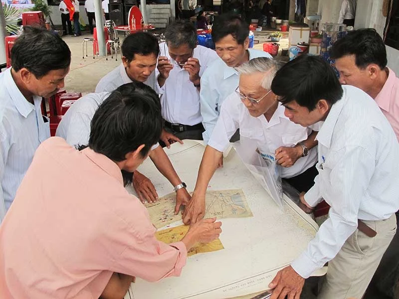 Các cựu chiến binh Trường Sa xem lại bản đồ về trận chiến Gạc Ma ngày 14-3-1988. Ảnh: TẤN LỘC