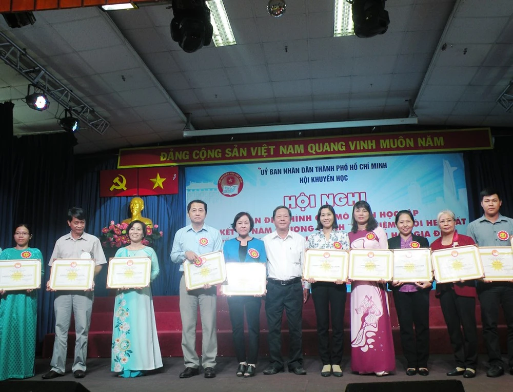 Ông Nguyễn Huy Cân, Chủ tịch Hội Khuyến học TP.HCM, tặng bằng khen cho những tập thể có thành tích trong chương trình "tiết kiệm nuôi heo đất khuyến học"