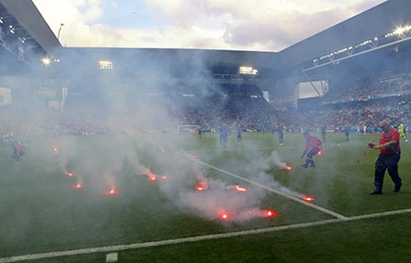 Hàng chục mẫu pháo sáng được ném xuống sân