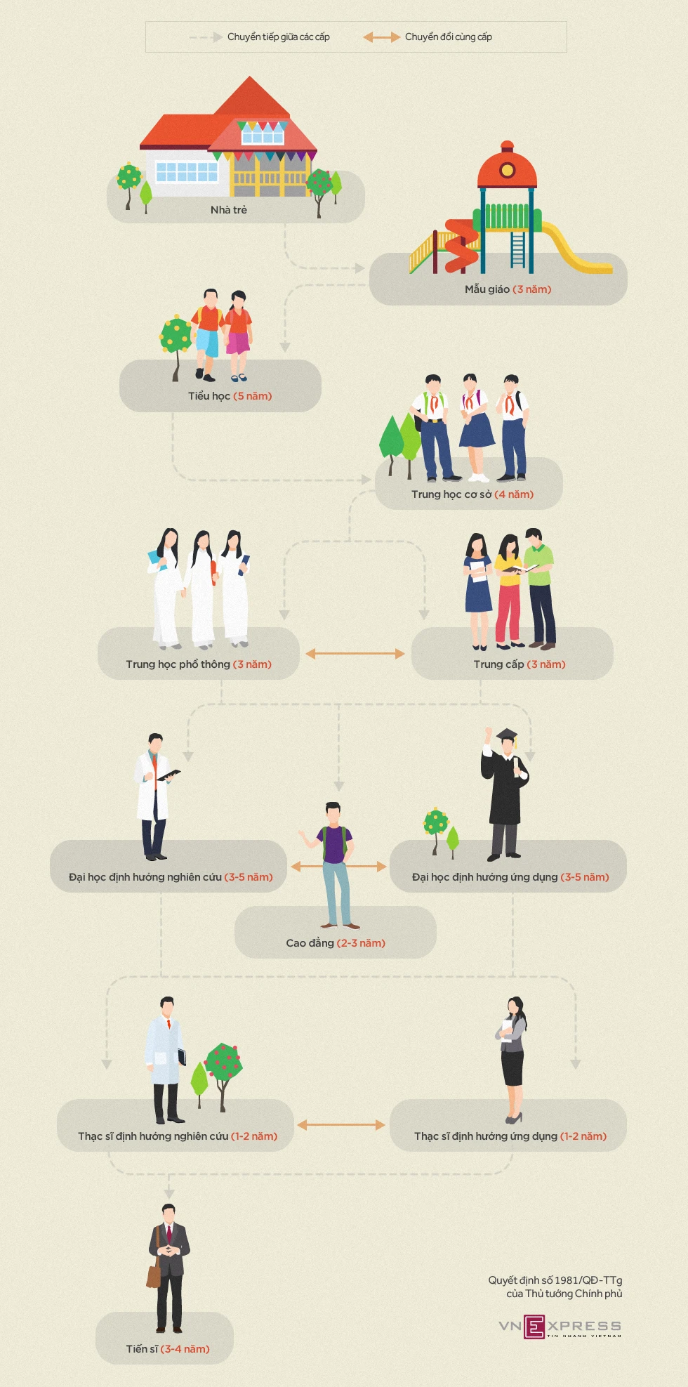 Theo quyết định do Thủ tướng phê duyệt, hệ thống giáo dục quốc dân gồm 4 cấp, trong đó giáo dục phổ thông gồm tiểu học, THCS và THPT; giáo dục đại học gồm trình độ đại học, thạc sĩ và tiến sĩ.