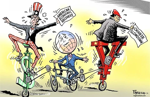 Kinh tế Mỹ đang hồi phục đã bị tác động từ nền kinh tế Trung Quốc trở nên trì trệ. Biếm họa của PARESH NATH (báo The Khaleej Times của Các Tiểu vương quốc Ả Rập thống nhất)