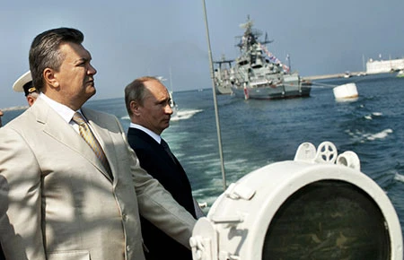 Tổng thống Nga Vladimir Putin và Tổng thống Ukraine Viktor Yanukovych thăm quân cảng Sevastopol vào ngày 28-7-2013. Ảnh: GETTY IMAGES
