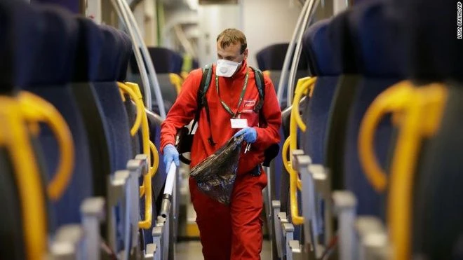 Nhân viên tẩy trùng trên tàu ở Milan, Italy ngày 28-2. Ảnh: AP