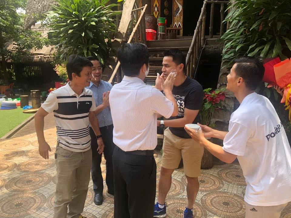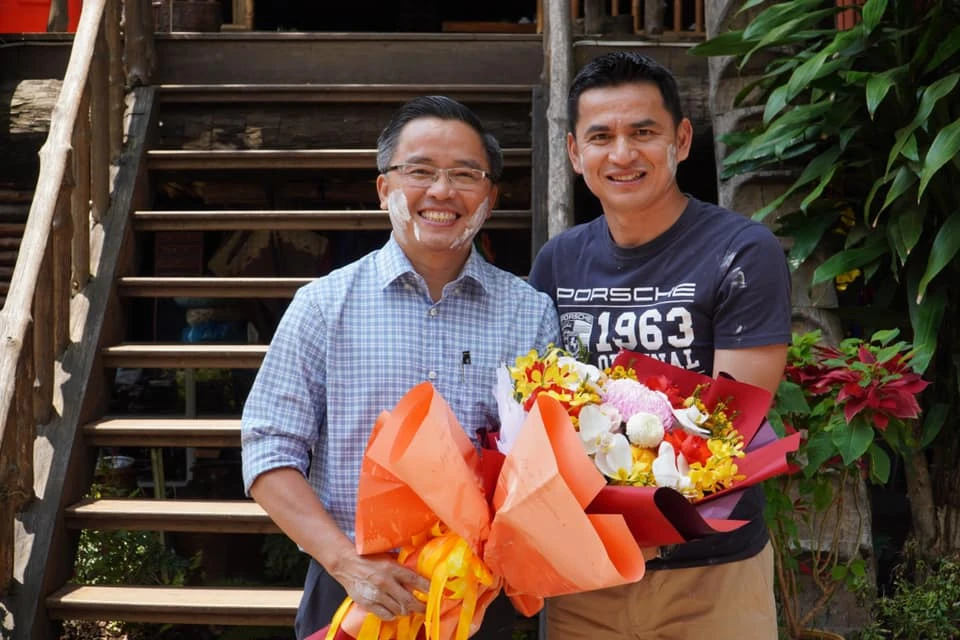 Trưởng đoàn Nguyễn Tấn Anh vui vẻ trong lễ té nước và bôi bột mì lên hai bên má cùng Zico Thái, theo những phong tục cổ truyền của người Thái cầu may mắn trong năm mới.