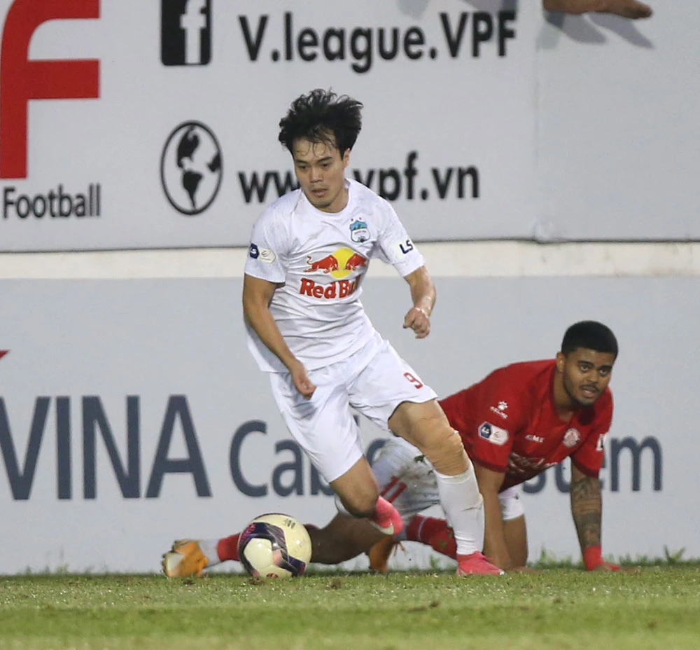 Văn Toàn lần này tìm penalty thành công cho HA Gia Lai. Ảnh: VPF (trận HA Gia Lai- TP.HCM)