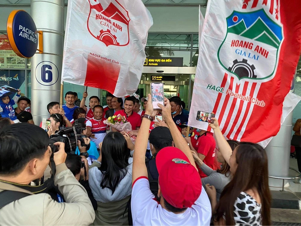 Người hâm mộ cầm cờ và bangdrole chào đón "Sắc" tại sân bay Pleiku. Ảnh: CTV
