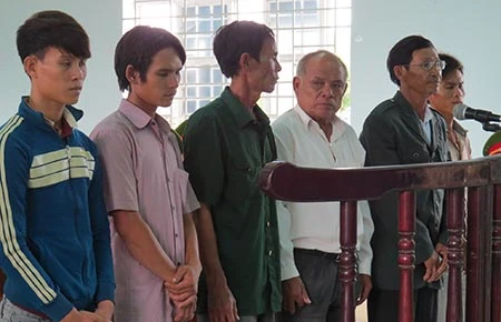Sáu bị cáo tại phiên tòa lưu động ở hội trường UBND xã Phước Ninh (Thuận Nam, Ninh Thuận) sáng 1-8. Ảnh: M.TRÂN