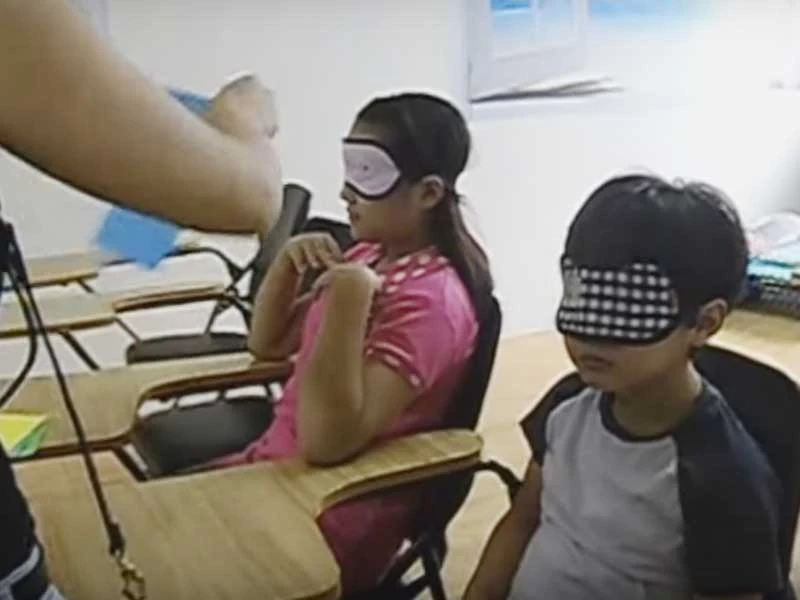 Trẻ đang được huấn luyện bịt mắt đoán màu sắc tại Trung tâm Trí Tuệ Việt. (Ảnh chụp từ clip)