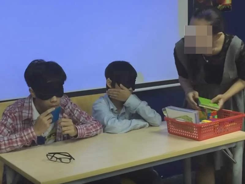 Trẻ đang học cách đoán màu sắc trong khi bị bịt mắt. (Ảnh chụp từ clip)