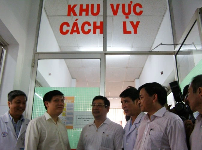 Thứ trưởng Bộ Y tế Nguyễn Thanh Long (thứ hai từ trái qua) đang khảo sát khu vực cách ly bệnh nhân bệnh truyền nhiễm tại BV Chợ Rẫy. Ảnh: TRẦN NGỌC