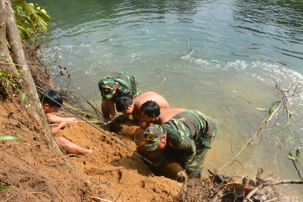 Lực lượng quân đội di chuyển quả bom từ dưới sông lên để kích nổ. Ảnh: NGỌC CƯỜNG