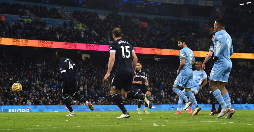Trong hiệp một, Man. City kiểm soát bóng vượt trội lên đến 67%, nhưng đội khách West Ham mới là đội có được cơ hội nguy hiểm đầu tiên. Phút thứ 6, từ pha đi bóng của tiền đạo Michail Antonio, bóng được chuyền vào vòng vòng cấm, tuy nhiên Said Benrahma lại không thể có được cú sút trước vòng 5m50.