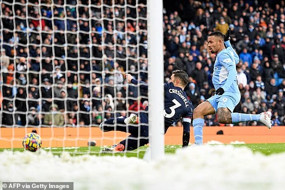 Hậu vệ Cresswell cản phá bàn thắng của Grabiel Jesus trên vạch vôi. Ảnh: Getty Images.