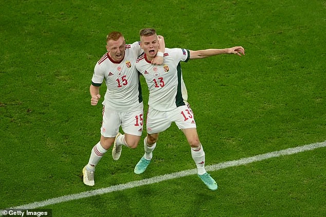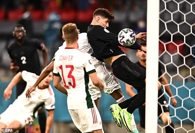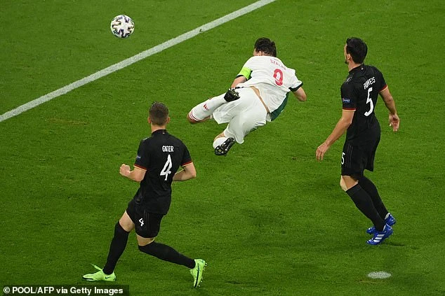Ở trận Đức gặp Hungary, Szalai bay người đánh đầu ghi bàn giúp Hungary bất ngờ kết thúc hiệp một với lợi thế dẫn trước 1-0. Ảnh: Getty Images.