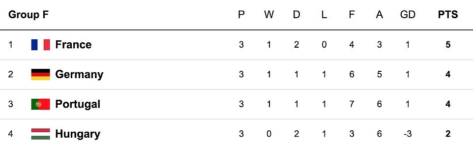 Ở cặp đấu cùng giờ, tuyển Đức có màn rượt đuổi tỷ số vô cùng nghẹt thở với Hungary khi có được kết quả hòa tương tự 2-2. Qua đó tuyển Đức kết thúc vòng bảng với vị trí thứ hai khi cùng điểm số và hiệu số với Bồ Đào Nha, nhưng hơn thành tích đối đầu, tuyển Pháp chiếm ngôi đầu bảng F với 5 điểm.