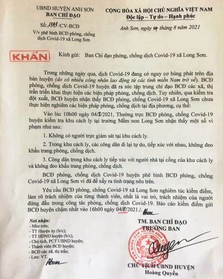 Trước đó, vào lúc 10 giờ sáng 4-8, Ban chỉ đạo phòng, chống dịch COVID-19 huyện Anh Sơn đi kiểm tra tại Khu cách ly đóng ở Trường Mầm non xã Long Sơn nhận thấy một số vi phạm: Không có người trực giám sát cách ly; trong khu cách ly các công dân đi lại tự do, tiếp xúc với nhau, không đeo khẩu trang phòng, chống dịch; người trong khu cách ly tiếp xúc với người nhà tại cổng của khu cách ly và không đeo khẩu trang phòng, chống dịch.