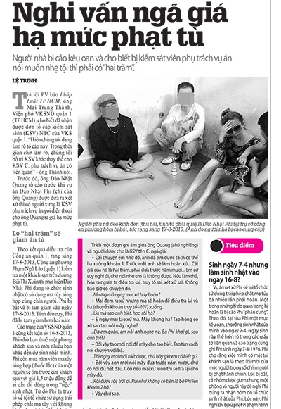 Tuy vậy, ông Đào Nhật Quang (em trai Phi) tố cáo trước khi vụ án được đưa ra xét xử thì có người xưng là KSV phụ trách vụ án nói với ông Quang nếu lo “hai trăm” thì sẽ chuyển khung hình phạt từ khoản 2 xuống còn khoản 1 (từ hai đến bảy năm tù). Người này cũng hướng dẫn khi ra tòa Phi nên khai như thế nào để được xử dưới khung truy tố. KSV này yêu cầu ông Quang phải đưa trước “năm chục” làm tiền cọc để hoãn phiên tòa và sau đó tác động để điều tra, truy tố lại Phi với mức án chỉ còn 2,5 năm tù.