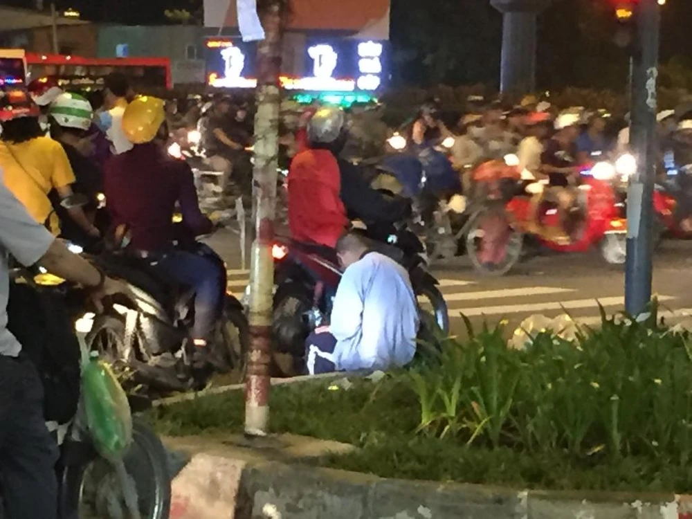 Thanh niên áo xanh đổi vị trí, ngồi vào chỗ người đàn ông có chiếc loa "kẹo kéo". Ảnh chụp tối 24-8 tại vòng xoay Phạm Văn Đồng