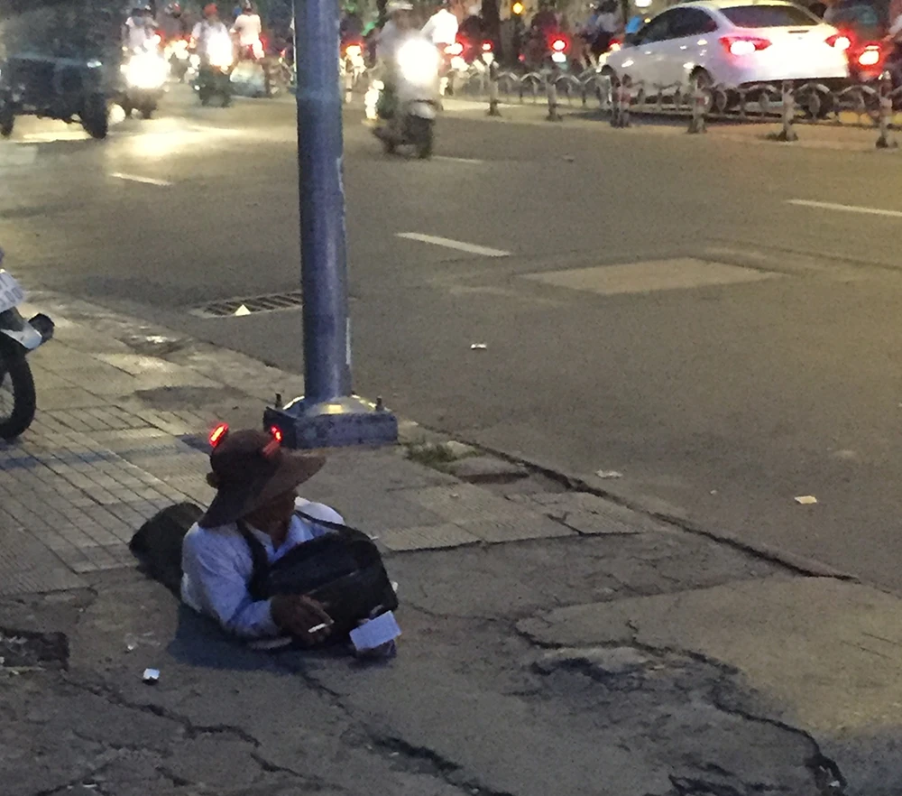 Điều lạ là trên đầu người này có chiếc mũ gắn nhiều chiếc đèn màu đỏ. Chúng nhấp nháy như nhịp điệu của tín hiệu cứu hỏa, có lẽ để thu hút sự chú ý của mọi người và phòng ngừa tai nạn giao thông (trong trường hợp phải bò qua đường). Thêm nữa, anh này có một chiếc loa chạy bằng pin, liên tục phát ra những “bản tụng” được ghi âm nói về đạo lý ăn ở nhân nghĩa, ở hiền gặp lành...