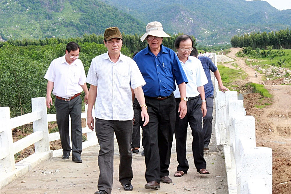 Ông Nguyễn Đức Hòa (áo trắng) cùng đoàn công tác kiểm tra vị trí cầu máng bị đổ sập, hư hỏng