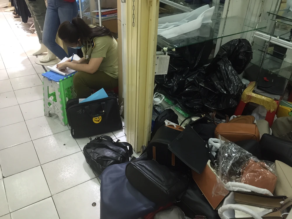 QLTT đang kiểm ghi biên bản tại một sạp kinh doanh túi xách tại Saigon Square