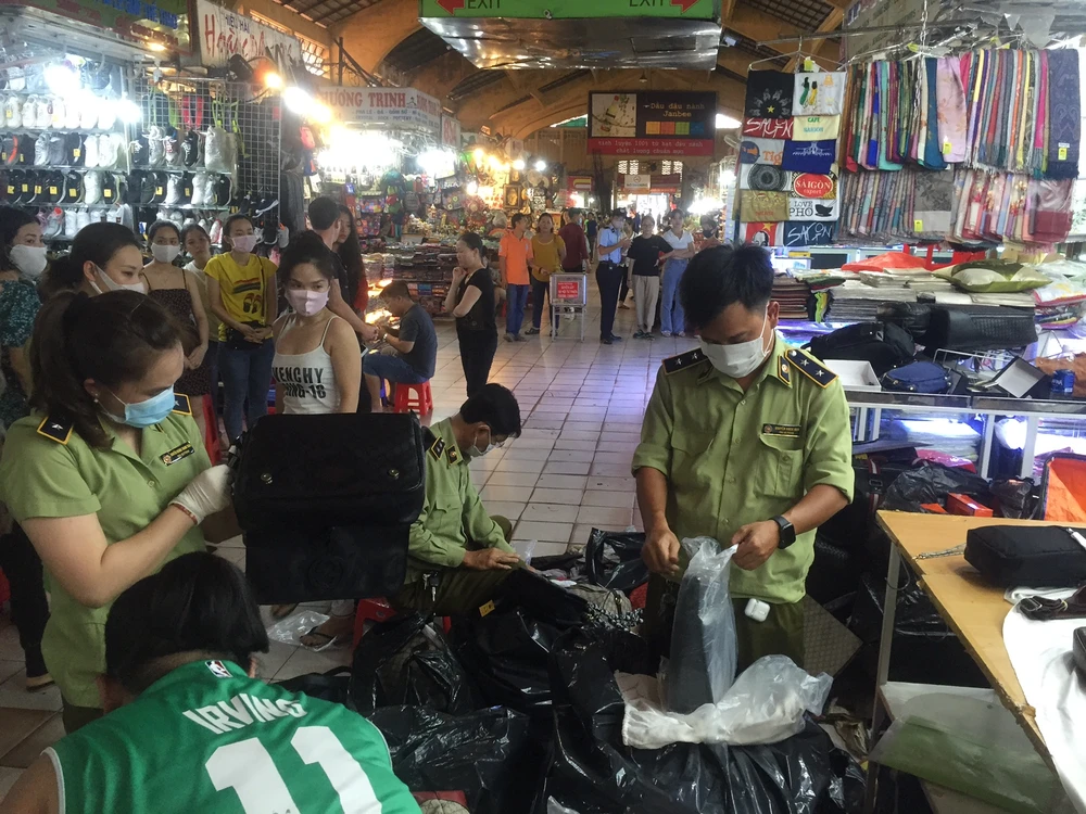Cục QLTT TP.HCM cho biết qua kiểm tra 10 điểm kinh doanh hồ đeo tay, mắt kính, túi xách, thắt lưng... tại chợ Bến Thành, lực lượng QLTT phát hiện hơn 1.200 đơn vị sản phẩm giả các thương hiệu nổi tiếng Rolex, Montblanc, Longines; Gucci; Montblanc; Chanel, Louis Vuitton; Hermes... Tổng giá trị hàng vi phạm 117 triệu đồng.