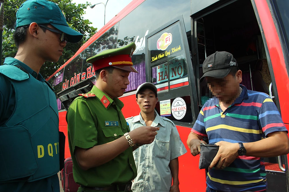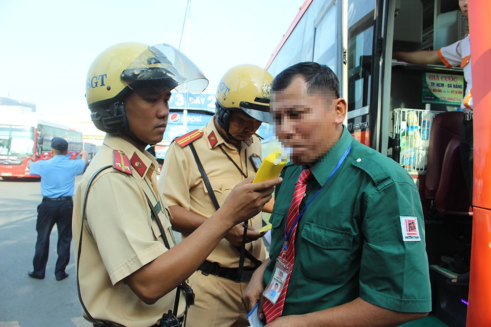 CSGT kiểm tra các tài xế xe khách đang xuất bến từ BXMĐ, sáng nay. Ảnh: L. THOA