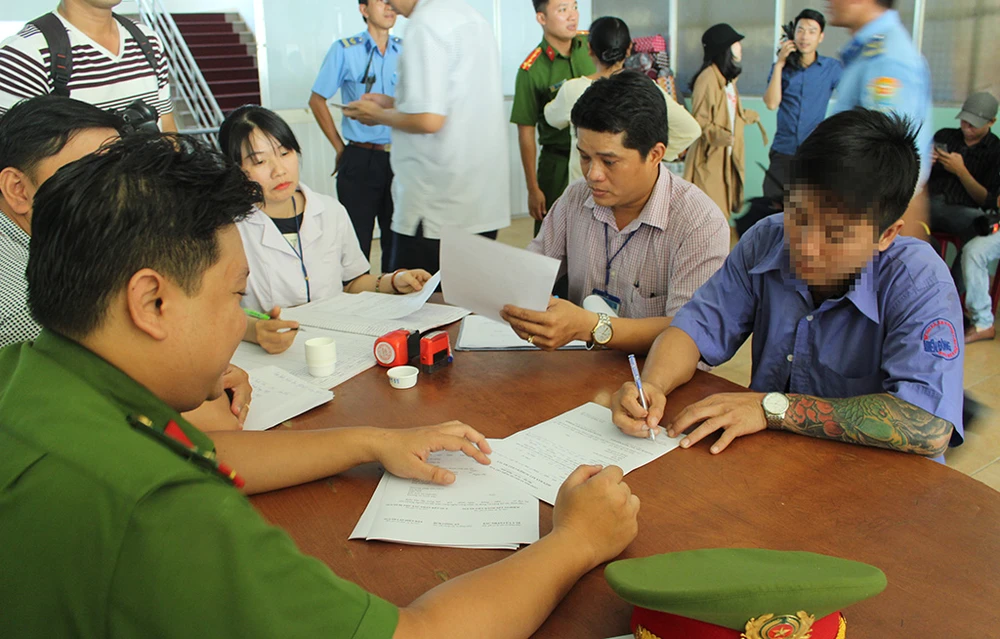 Tài xế làm việc với công an trước khi test ma túy. Ảnh: L. THOA