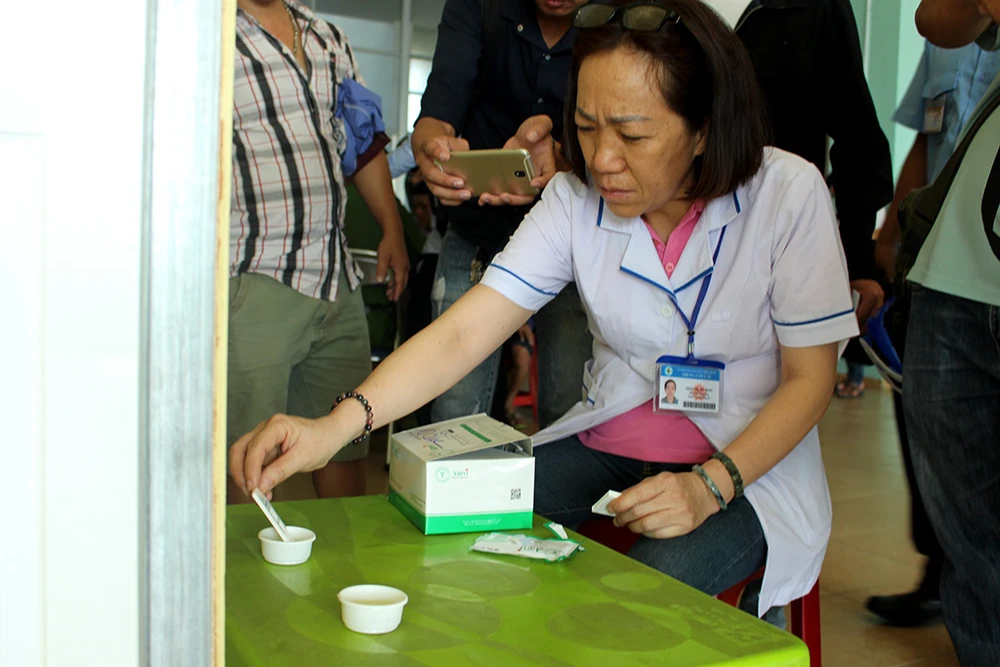 Nhân viên Trạm y tế phường 26 đang test nước tiểu. Ảnh: L. THOA