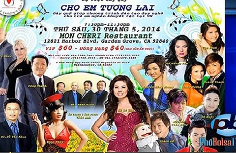 Được biết tối 30-5-2014, chương trình dạ tiệc gây quỹ từ thiện mang tên “Cho em tương lai” được tổ chức tại California (Mỹ) với nhiều nghệ sĩ tham gia. Buổi diễn thu được 50.000 USD, chưa kể một số khoản tiền khác các mạnh thường quân sẽ chuyển sau.