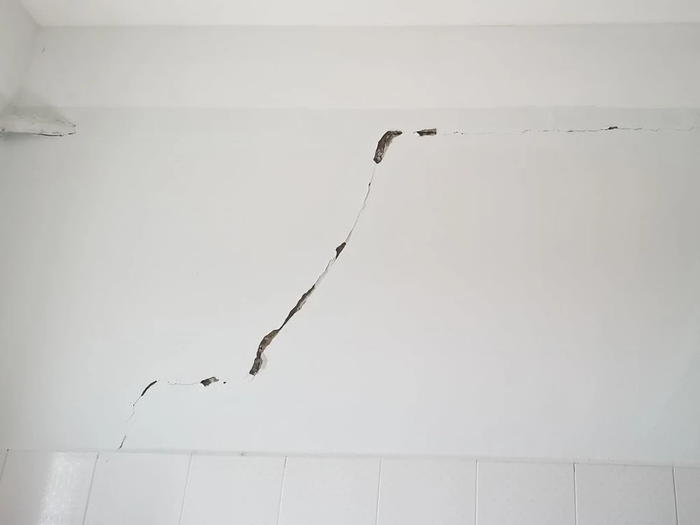 Vết nứt xéo này nghi có liên quan đến kết cấu chịu lực. Ảnh: TRẦN VŨ