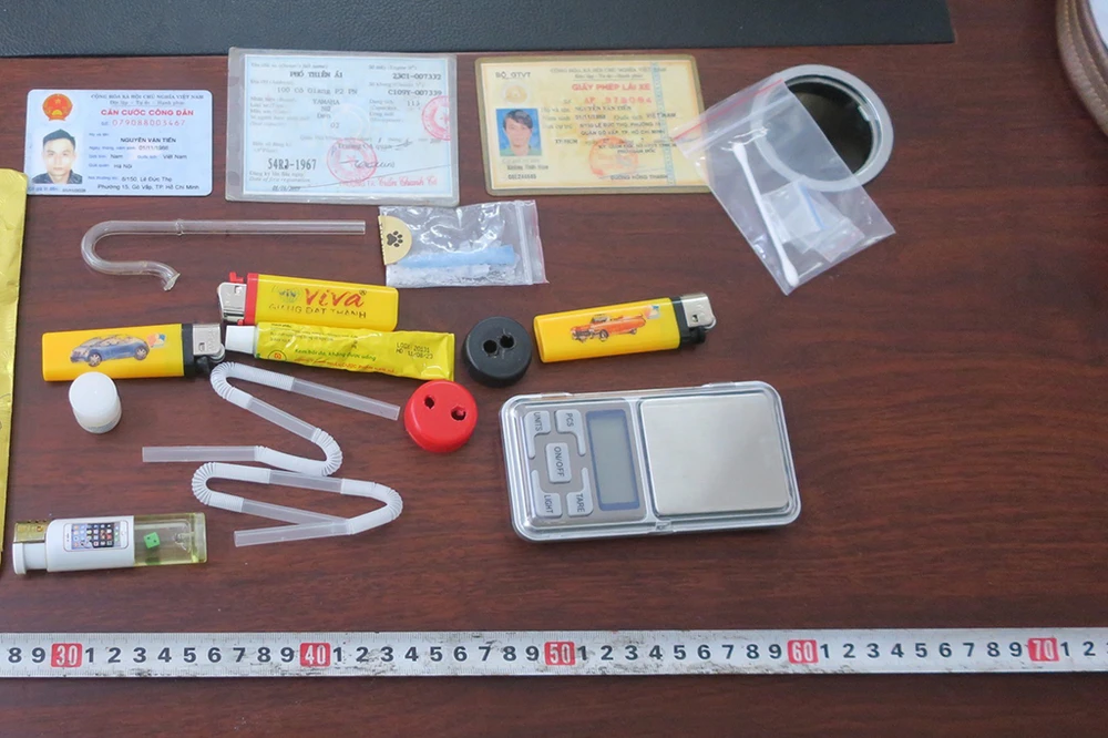 Tổ công tác nhận thấy người này có biểu hiện mới sử dụng ma túy, nên đã tiến hành kiểm tra và phát hiện trên túi đeo trước ngực có chứa một gói nylon chứa tinh thể không màu nghi là ma túy và dụng cụ dùng để sử dụng ma túy.