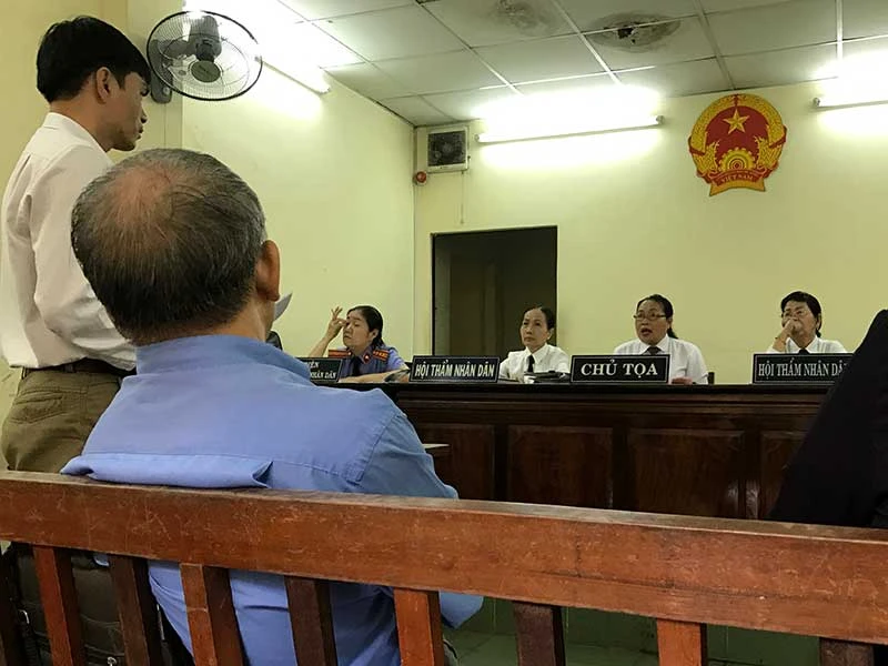 Ông Vũ Mạnh Cường (đại diện nguyên đơn, đứng)đang tranh luận tại phiên tòa. Ảnh: H.YẾN