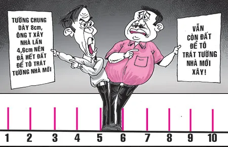 Ông Cảnh thì cho rằng việc ông Thân thiếu đất có thể là thiếu về phía giáp ranh khác. Hai bức tường chung làm ranh giới có bề dày 8 cm, tức mỗi hộ có 4 cm. Nhưng nay sau khi ông Thân xây nhà, bức tường còn lại chỉ 3,4 cm, tức là ông Thân đã chiếm 0,6 cm nên không còn đất để sơn trát. Nếu ông Thân sơn trát thì sẽ “cuỗm” nguyên bức tường chung mất.