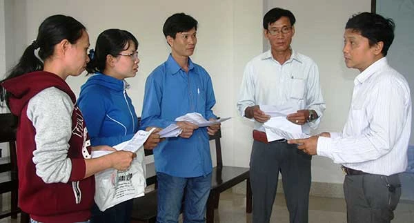 Cán bộ LĐLĐ tỉnh Khánh Hòa (phải)đang tư vấn cho công nhân khởi kiện. Ảnh: THỤY NGA