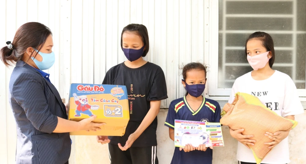 Các em nhỏ có hoàn cảnh khó khăn của huyện Châu Thành (Kiên Giang) nhận hỗ trợ nhu yếu phẩm từ chính quyền trong đợt dịch bệnh COVID-19. Ảnh: MINH QUÂN