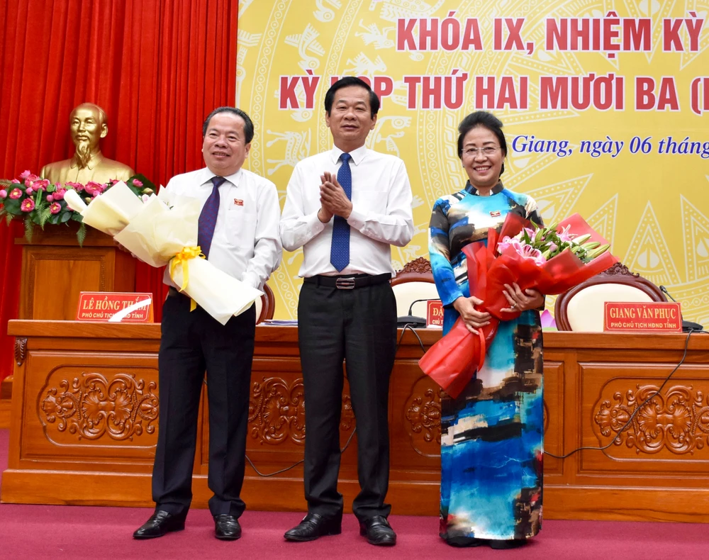 Ông Mai Văn Huỳnh (bìa trái) được HĐND bầu giữ chức Chủ tịch HĐND tỉnh Kiên Giang, nhiệm kỳ 2016-2021 thay cho bà Đặng Tuyết Em (bìa phải) nghỉ hưu theo quy định. Ảnh: HM