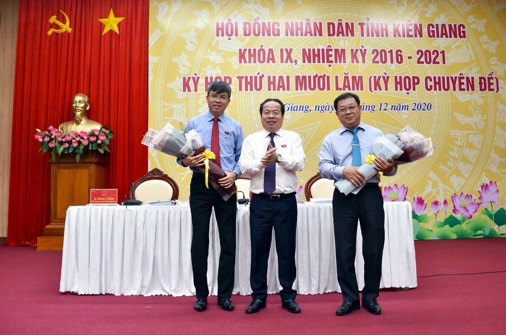 Ông Nguyễn Lưu Trung (bìa trái) được HĐND bầu giữ chức Phó Chủ tịch UBND tỉnh Kiên Giang, nhiệm kỳ 2016-2021. Ảnh: BT