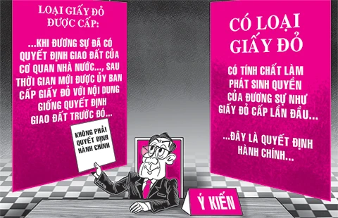 Trong khi đó, Phó Chánh án TAND Tối cao Tống Anh Hào thì nghiêng về quan điểm giấy đỏ là quyết định hành chính, là đối tượng khởi kiện vụ án hành chính. Ông Hào phân tích: Nhà nước có bảy quyền trong quản lý đất đai, trong đó có quyền trao quyền sử dụng đất cho tổ chức, cá nhân. Điều 17 Luật Đất đai hiện hành nêu ba phương thức trao quyền sử dụng đất là giao đất, cho thuê đất, công nhận quyền sử dụng đất. Ông Hào dẫn khoản 9 Điều 3 Luật Đất đai hiện hành quy định: Công nhận quyền sử dụng đất là Nhà nước trao quyền sử dụng đất cho người sử dụng đất lâu dài thông qua cấp giấy đỏ. Khoản 16 Điều 3 Luật Đất đai hiện hành cũng quy định giấy đỏ là chứng thư pháp lý để Nhà nước công nhận quyền sử dụng hợp pháp cho người sử dụng đất.