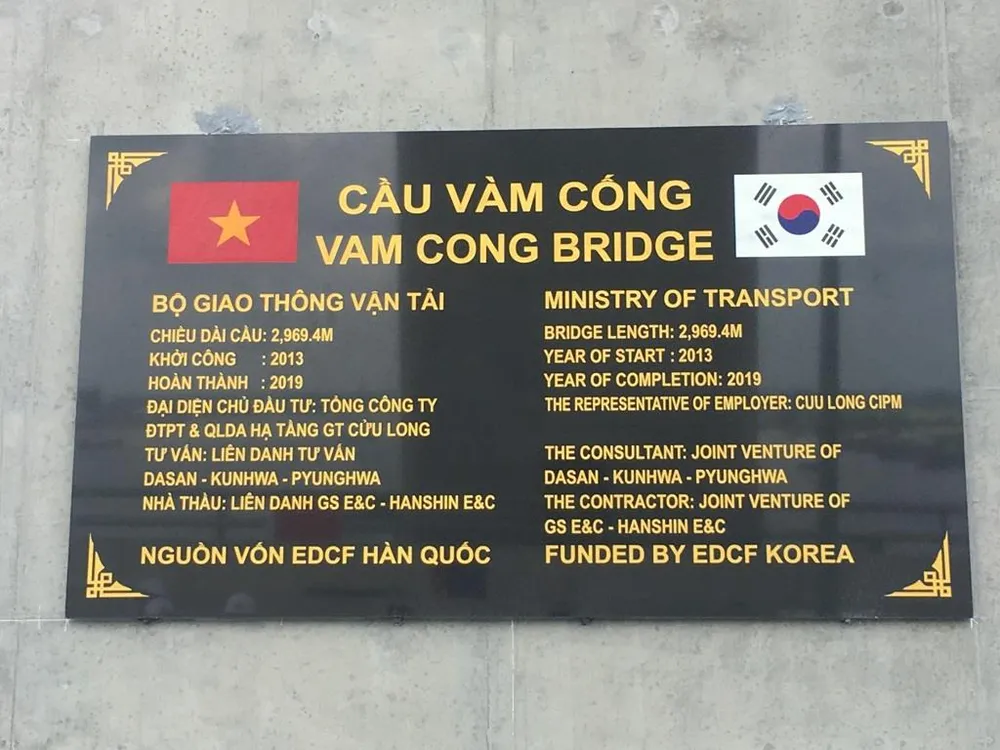 Bảng tên cầu Vàm Cống gắn trên cầu.