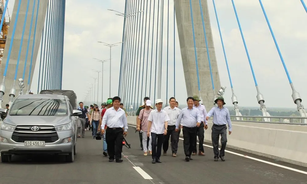 Lãnh đạo TP Cần Thơ cùng các sở, ngành lên cầu Vàm Cống thăm quan công tác chuẩn bị trước giờ cầu khánh thành.