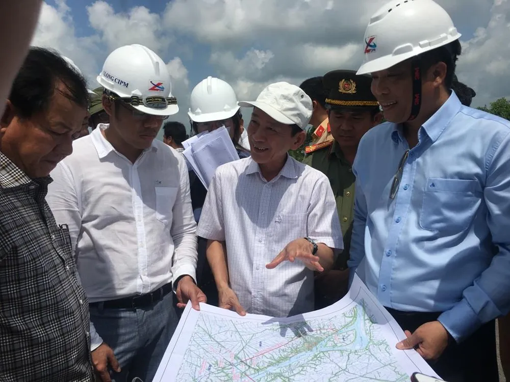 Chủ tịch UBND TP Cần Thơ Võ Thành Thống (người mặc áo trắng, nón vải trắng) trao đổi với lãnh đạo Tổng Công ty Cửu Long về chuẩn bị điểm khánh thành cầu Vàm Cống. Ảnh: NN