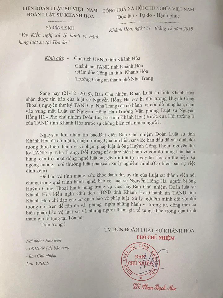 Công văn trên được gửi đến chủ tịch UBND tỉnh, chánh án TAND tỉnh, giám đốc Công an tỉnh Khánh Hòa, trưởng Công an TP Nha Trang. Công văn nêu: Sáng 21-12, ông Huỳnh Công Thoại có hành vi côn đồ, đấm vào vùng mắt LS Nguyễn Hồng Hà, Phó Chủ nhiệm Đoàn LS, trước cửa hội trường xét xử của TAND tỉnh Khánh Hòa trước sự chứng kiến của nhiều người. Ngay sau khi nhận tin báo, đại diện Ban chủ nhiệm Đoàn LS tỉnh Khánh Hòa đã có mặt tại hiện trường.