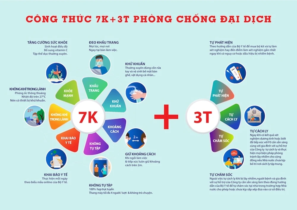 7K bao gồm “Khẩu trang - Khoảng cách - Khử khuẩn - Không tụ tập - Khai báo y tế - Không khí trong lành - Khỏe mạnh” và 3T là “Tự phát hiện - Tự cách ly - Tự chăm sóc”.