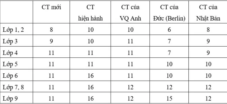 Theo số liệu của OECD (The Learning Environment and Organisation of Schools, 2009, có thể tìm trên trang https://www.oecd.org/education/skills-beyond-school/48631122.pdf), trong độ tuổi từ 7 đến 15, tương đương từ lớp 1 đến lớp 9, trung bình mỗi HS học 7.390 giờ (60 phút/giờ). Còn theo dự thảo CT tổng thể của Việt Nam, từ lớp 1 đến lớp 9, mỗi HS học nhiều nhất 6.957 giờ, kể cả thời gian tự học dành cho HS tiểu học và thời gian học các môn tự chọn.