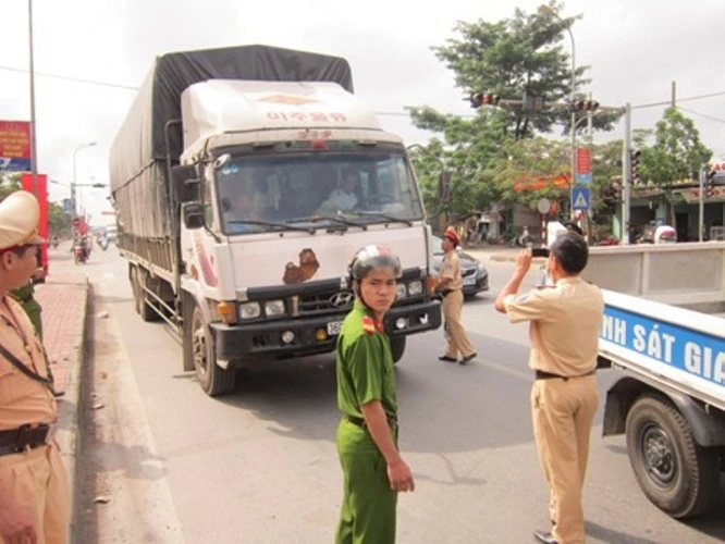 Lực lượng công an Thừa Thiên – Huế bắt một xe quá tải trên đường trốn chạy. Ảnh: Viết Long