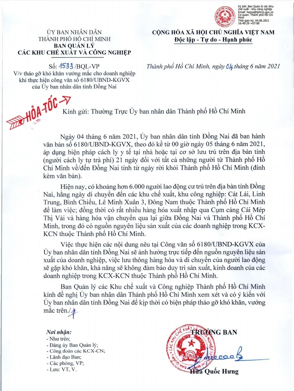 Chiều 4-6, Ban Quản lý các Khu chế xuất và công nghiệp TP.HCM đã có văn bản hỏa tốc gửi UBND TP.HCM về việc tháo gỡ khó khăn vướng mắc cho doanh nghiệp khi thực hiện công văn số 6180/UBND-KGVX của UBND tỉnh Đồng Nai.